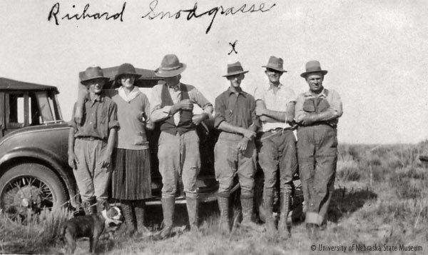 An artifact and fossil collecting expedition with the family dog Bo, Harold Andersen, Pauline Andersen, Perry Andersen, RIchard Snodgrasse, and two unidentified friends.